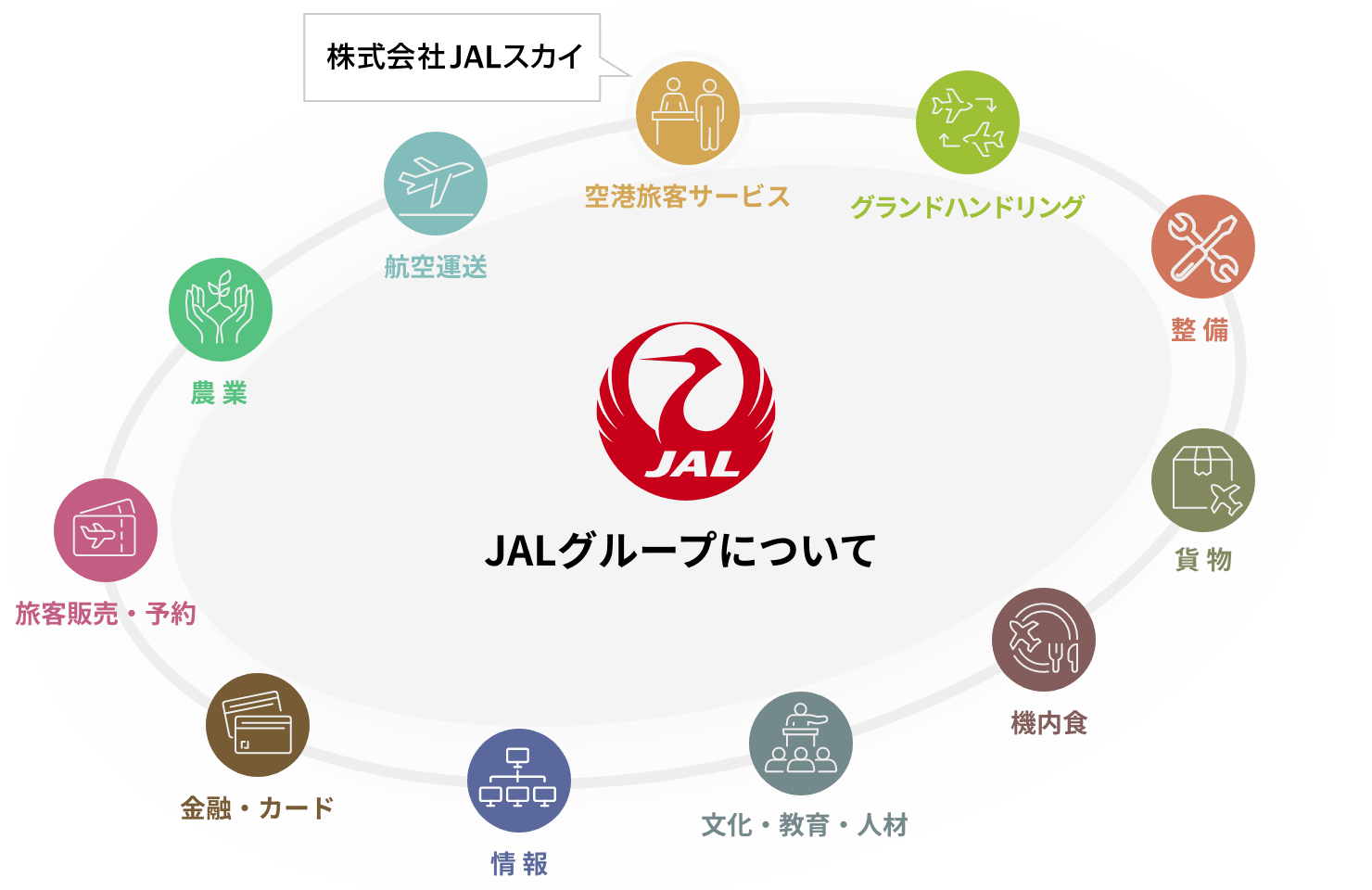 JALグループはさまざまな事業を展開しており、各事業領域でグループ一丸となって、安全運航の堅持、また付加価値の提供に努めています。