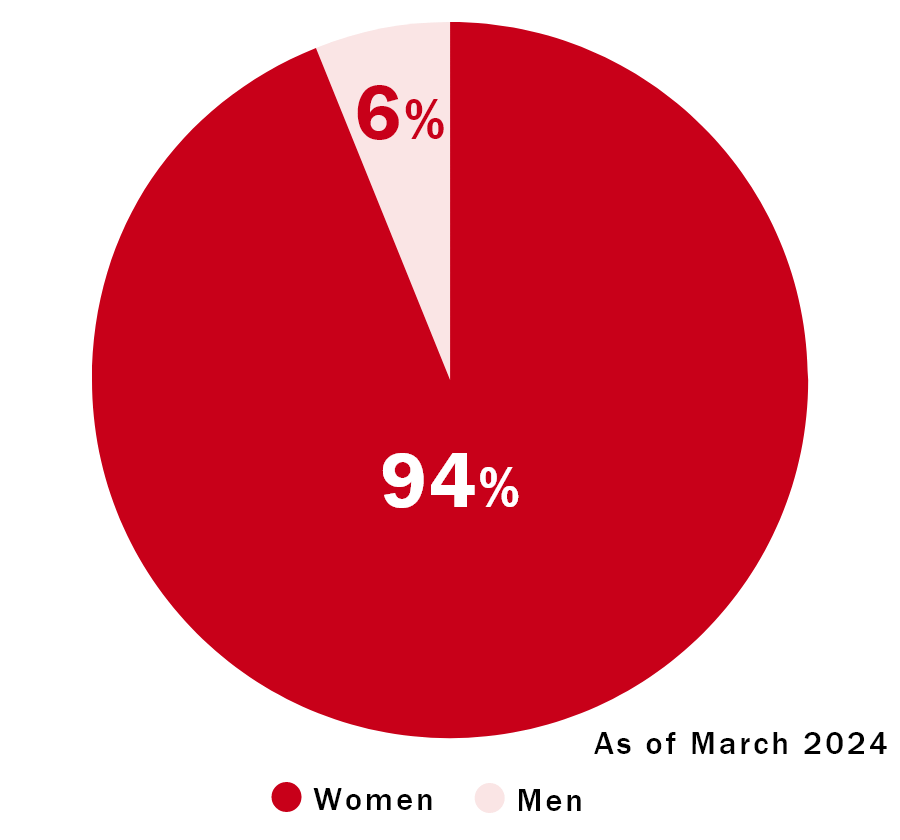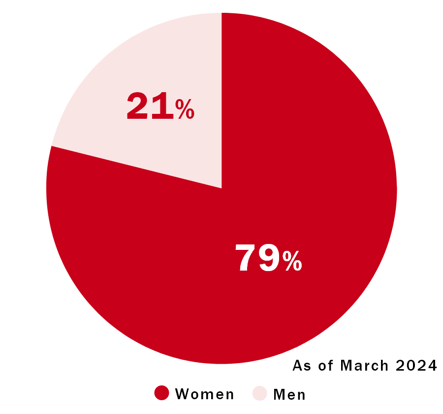 In December 2023, the Ministry of Health, Labour and Welfare recognized JAL SKY with Eruboshi (2nd level) certification as a company with outstanding efforts in empowering women. We have introduced initiatives to enable a diverse workforce to thrive, including measures to support career development and a mentoring system.
