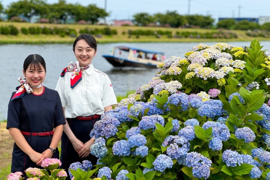 毎年6⽉、多古町の中⼼を流れる栗⼭川沿いでは約1万株の⾊鮮やかなあじさいを楽しむことができます。