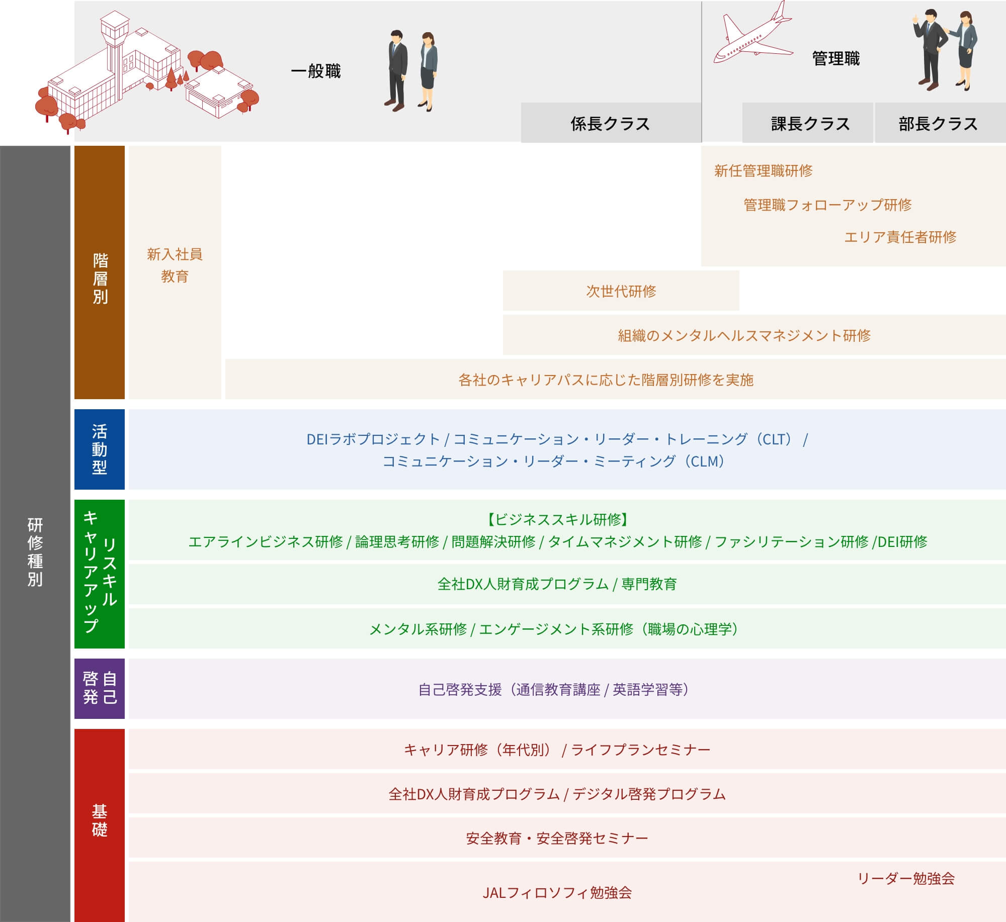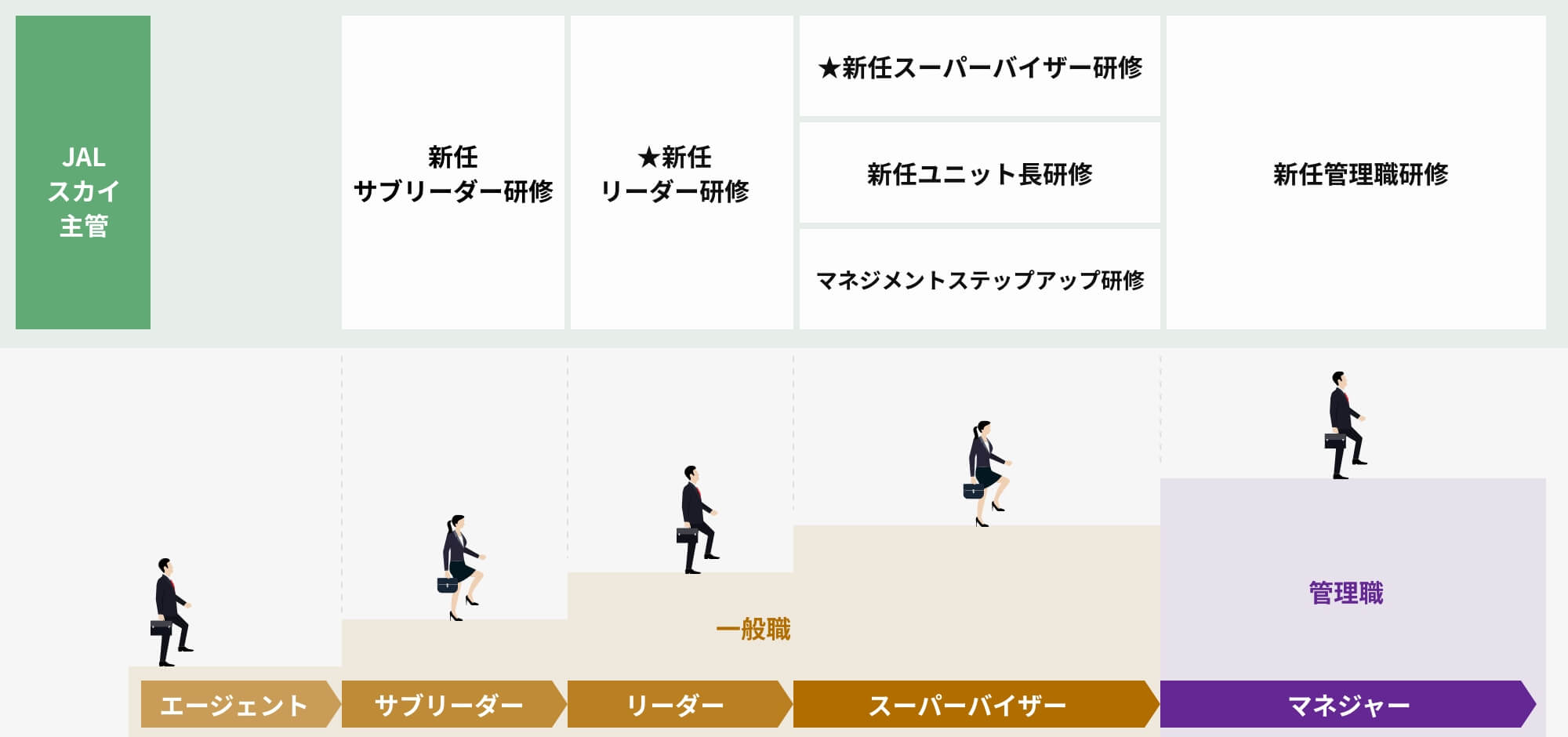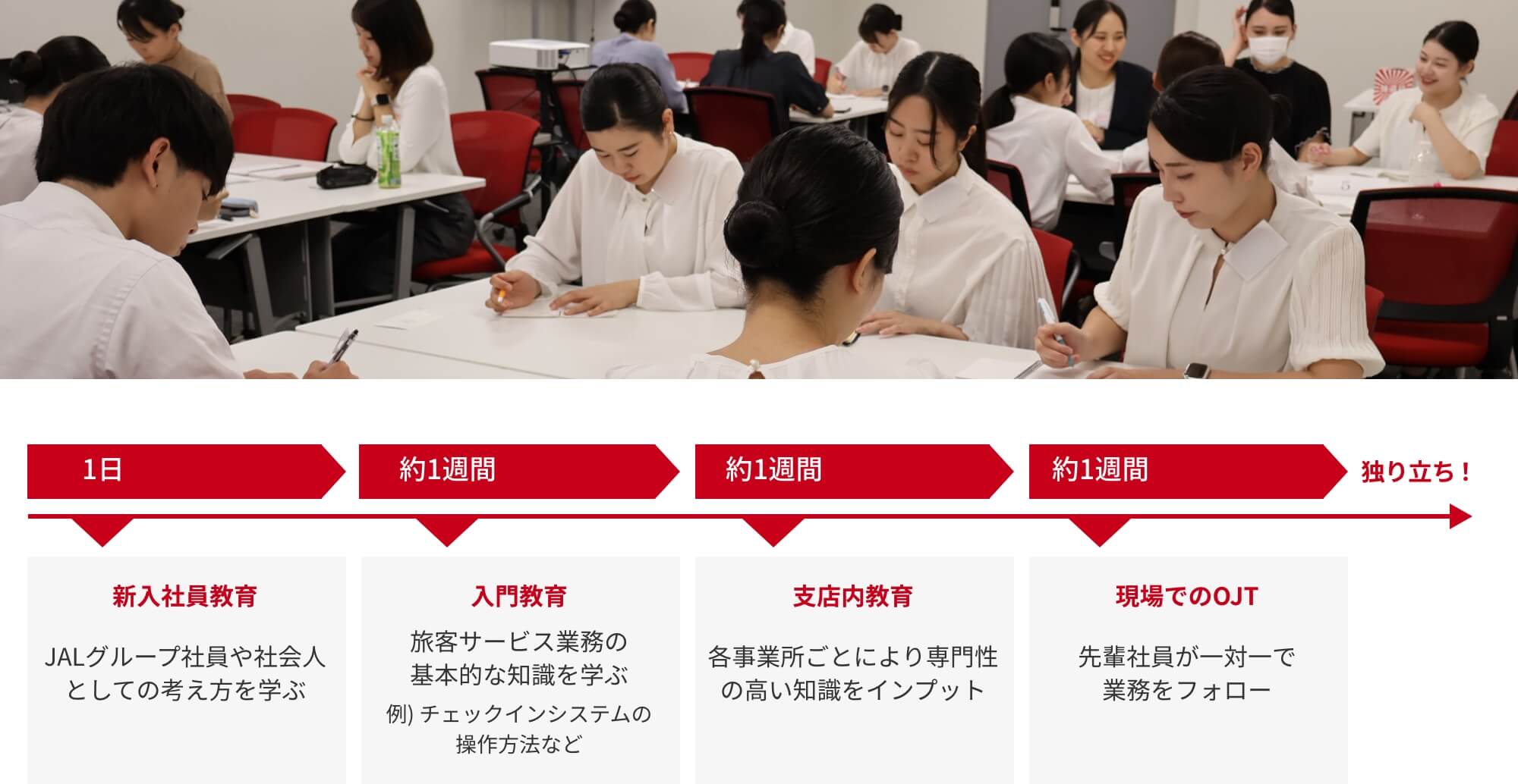 JALスカイ独⾃の階層別研修を⽤意しており、昇格後に新しい職階として働く上での⼼構えや求められる役割を学ぶことができます。