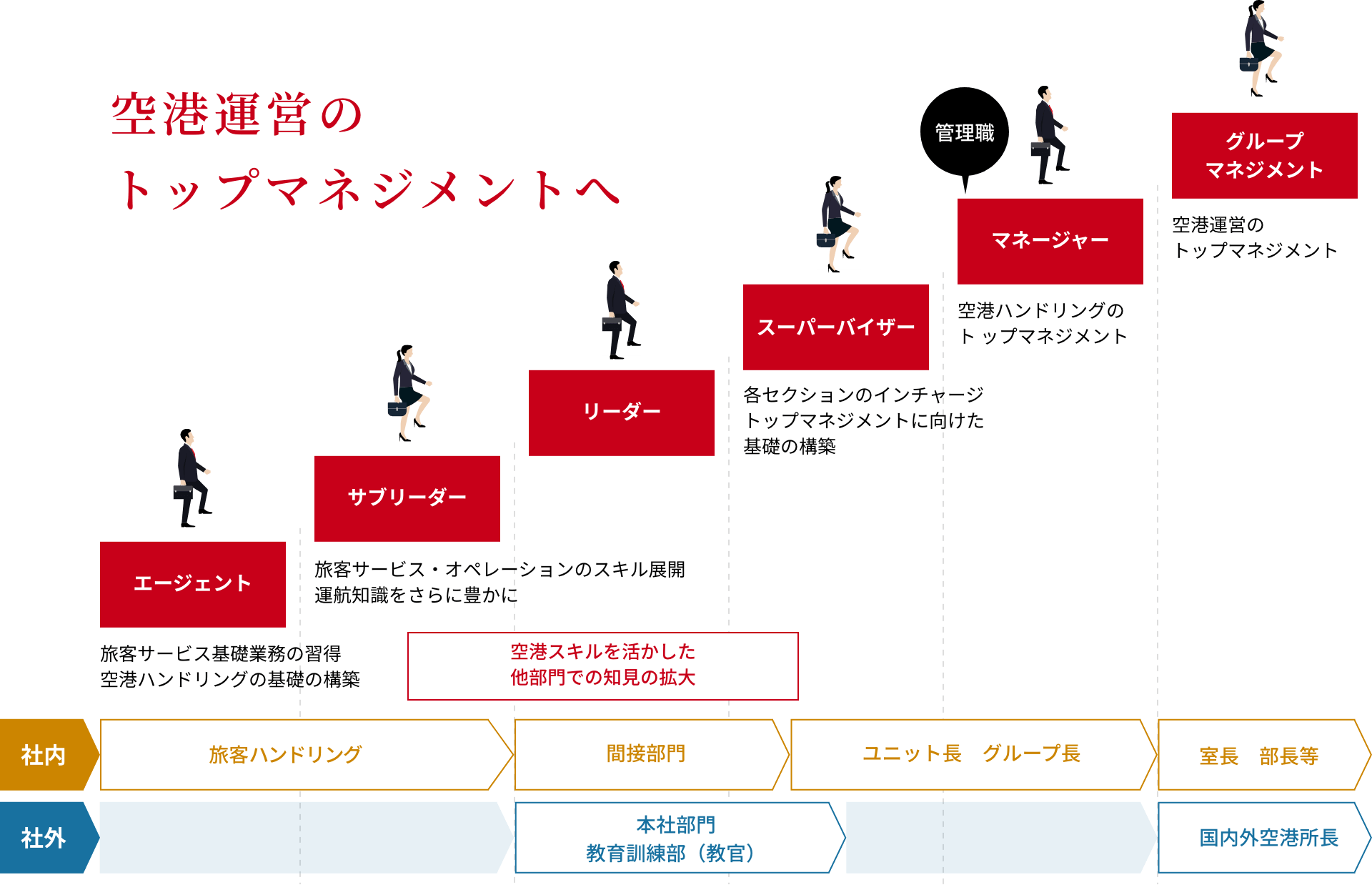 JALグループの基幹空港である羽田・成田空港での実務のプロフェッショナルとして、空港ハンドリングや空港運営のトップマネジメントを担うことが期待されており、空港運営の最高責任者などの「空港運営のトップマネジメント」を目指します。