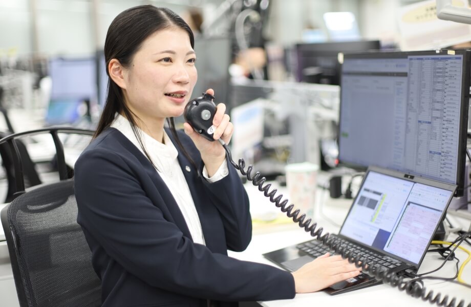 現在は、航空機運航管理者の指示のもと、飛行ルートや搭載燃料を記載する飛行計画書の作成や、無線通信を使って地上や上空にいる飛行機に天気などの諸情報を伝える飛行支援業務を行っています。飛行計画書の作成は国内線を担当しており、多い日で1日約300便。それを航空機運航管理者2名を含む計6名のメンバーで分担しています。